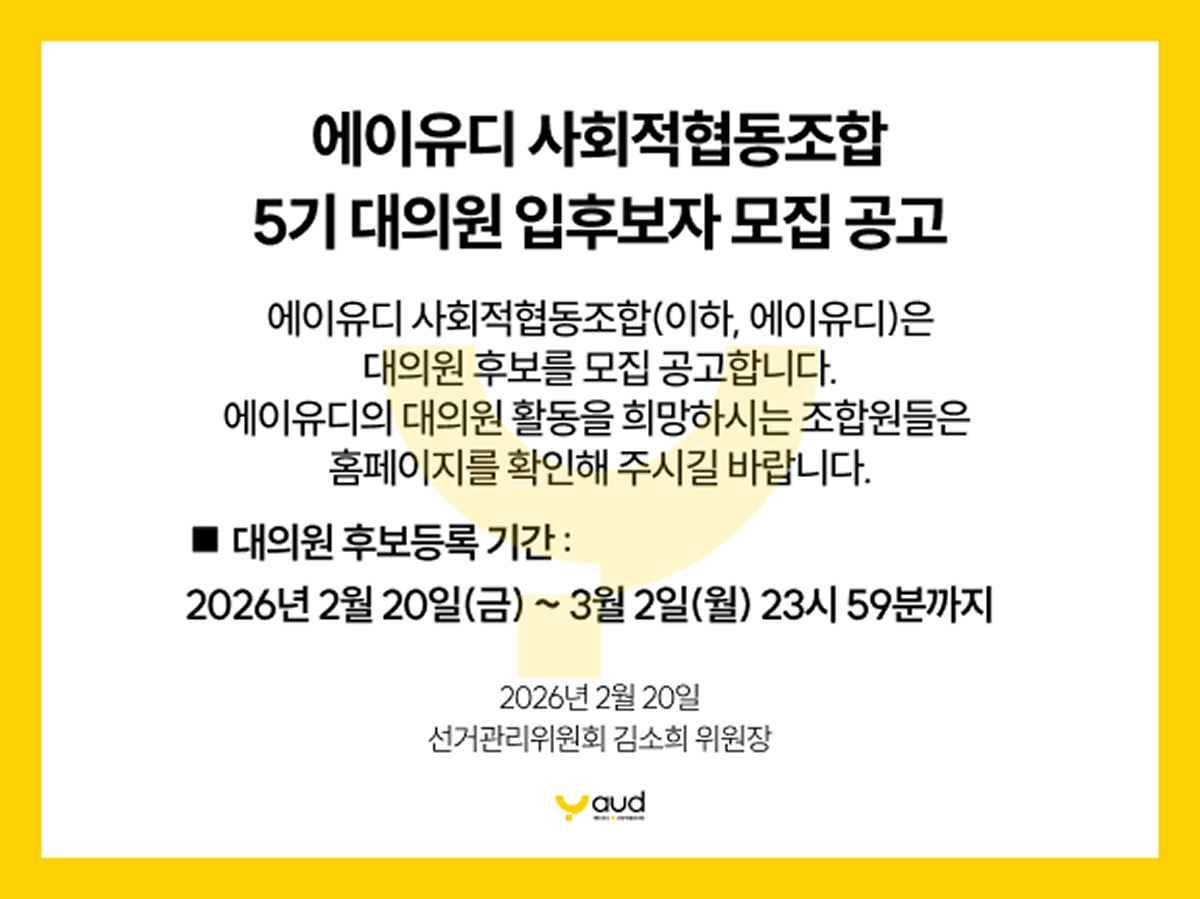 에이유디 사회적협동조합은 정관 제23조 1항에 의거하여 대의원 후보를 모집합니다.